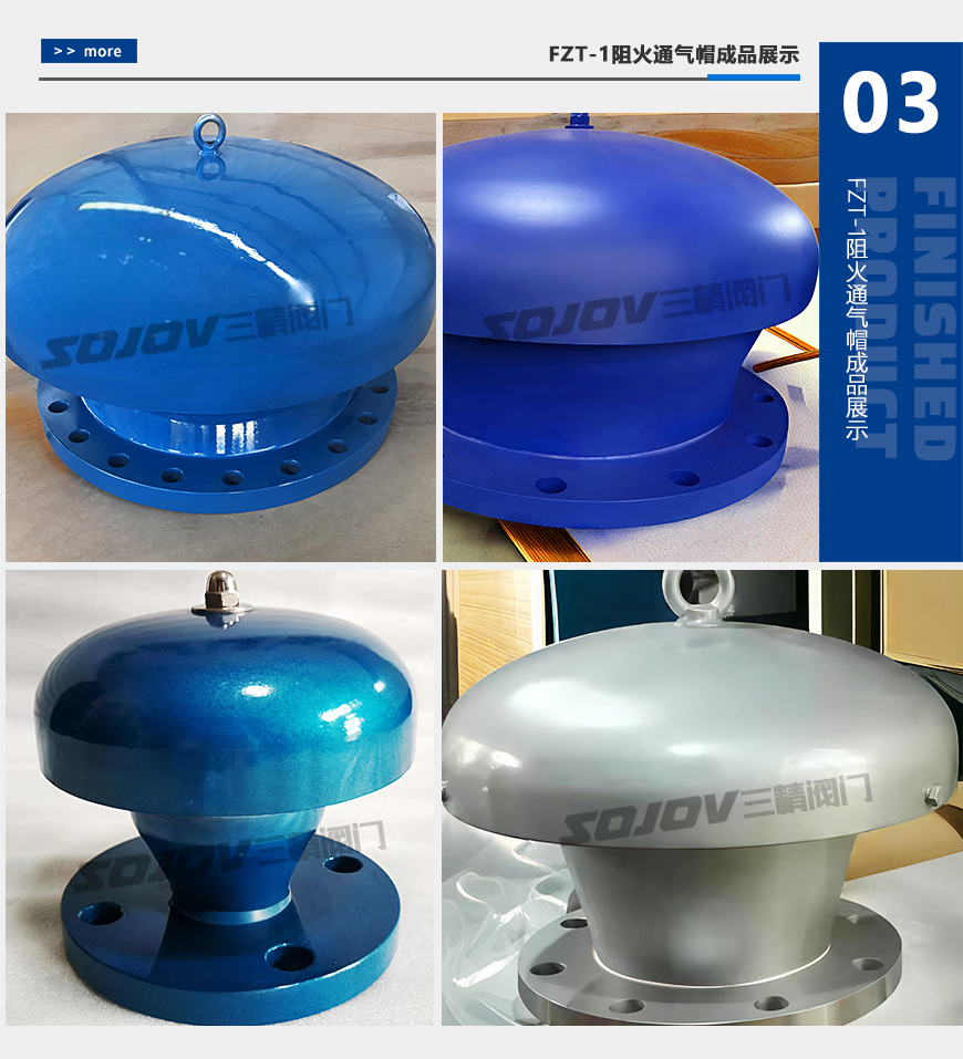 FZT-1阻火通氣帽量油孔為腳踏式、裝于油罐頂部,用于測量罐內(nèi)油品的標高和測度及取樣等作用。帶放水管排污孔裝于輕質(zhì)油罐,清掃罐時從此孔排出污泥,平時可以從此放水管排出罐內(nèi)的污水。