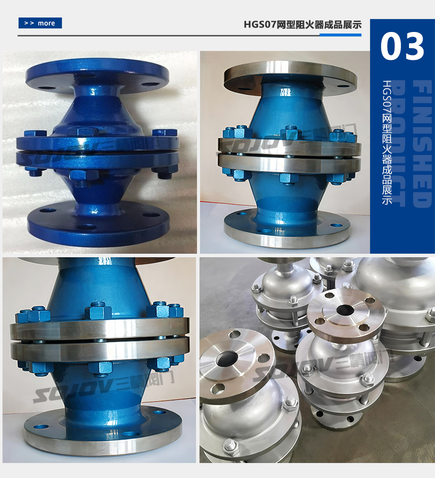 HGS07網(wǎng)型阻火器適用于儲存閃點低于28℃的甲類油品和閃點低于28℃的乙類油品,也適用地儲存物料以氮氣封頂?shù)墓绊敼奚,礫石阻火器與網(wǎng)型原理同上,用在管道上。與呼吸閥、呼吸人孔配套使用,亦可單獨使用。